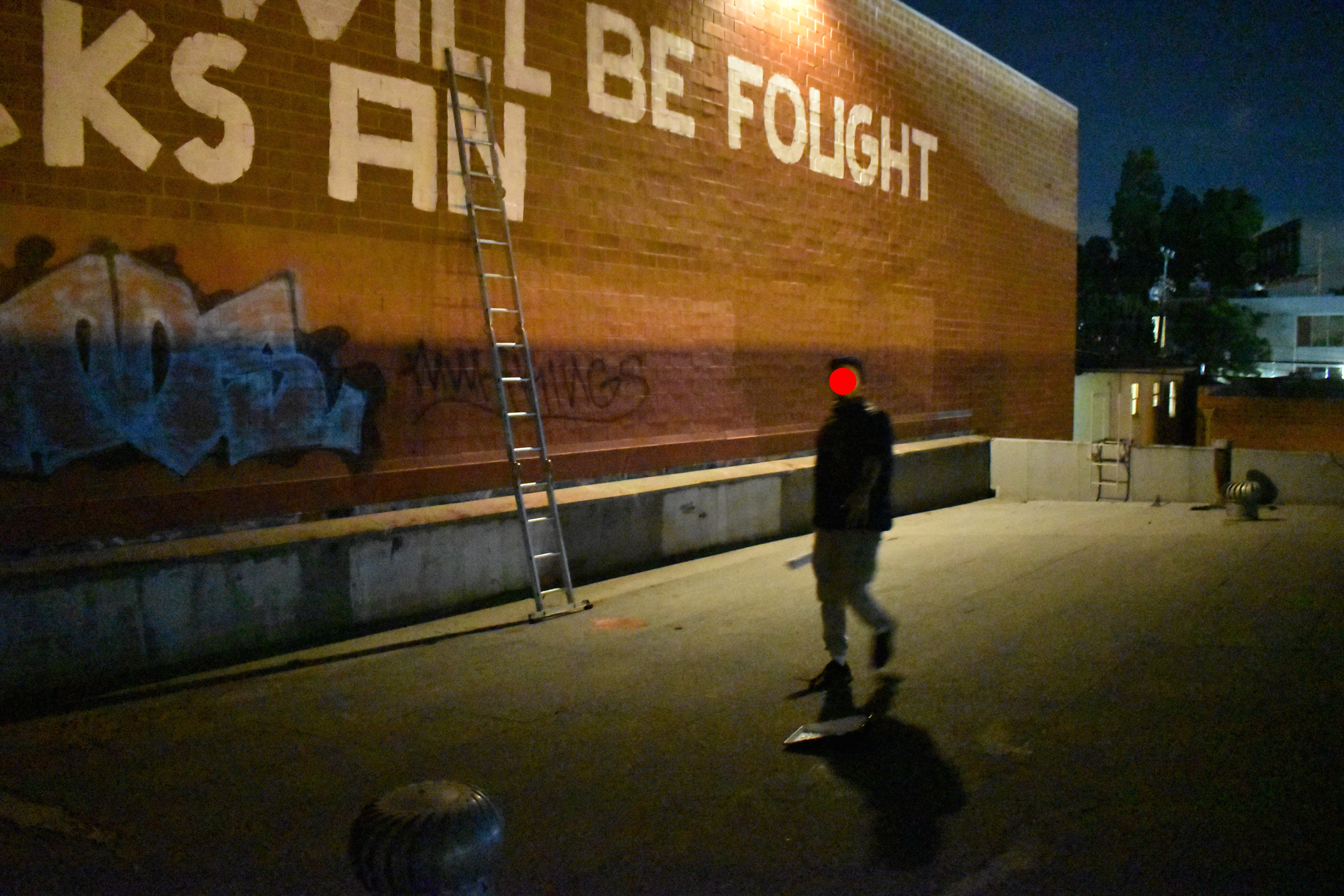 Step 1: Climb up at night to measure the width and height of the empty billboard space. Step 2: Go to the art store, buy two pieces of unstretched canvas, primer, paint pens and spray paint. Step 3: Take the two pieces of canvas to the tailor to have them sewn together. Step 4: Paint the piece. Step 5: Wake up early. Wear construction gear. Bring ladder, cable ties and artwork. Step 5: Make sure to get a photo! (Shoutout to my friend Kenny for being up there with me)
